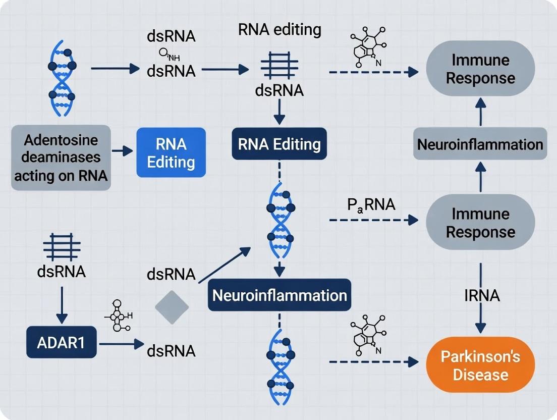 ADAR1 emerges as a critical molecular switch at the intersection of RNA metabolism, innate immunity, and neurodegeneration in Parkinson's disease. Foundational research solidifies its role in driving pathogenic neuroinflammation through dsRNA sensing pathways, while advanced methodologies now enable precise dissection of its functions in specific brain cell types. Although technical challenges remain, particularly in isoform-specific targeting and in vivo delivery, the validation of ADAR1 modulation in preclinical models presents a compelling therapeutic avenue. Future directions must prioritize the development of brain-penetrant, selective ADAR1 modulators, the rigorous clinical translation of ADAR1-related biomarkers, and a deeper exploration of its interactions with other PD genetic risk factors. Successfully harnessing or inhibiting ADAR1's editing activity could pave the way for a novel class of disease-modifying therapies that target the underlying neuroinflammatory component of Parkinson's disease.